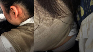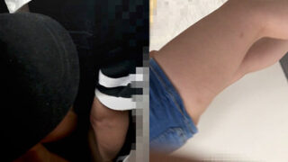 【176】の逆さ撮り。前回は縞々の下着でしたが、今回は薄い水色ですね。前から後ろから複数手が伸びてきます。尻撫でまわし、クリ攻め散々受けた後、手がパンティの中に入ってきてナマで手マンされます。その最中……