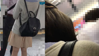【86】の逆さ撮り。JKらしいいい下半身しています。前側から下に手を伸ばすと、なんとか払いのけようとするJK。手をつかんで抑えたりします。気が強いんですね。そうこうしているうちに後ろから別の痴漢も参戦……