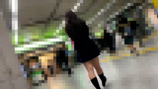 3人目は制服JK。 ホームに佇んでいる感じでは胸も張っており、色白で顔もかわいい。 電車が到着し、in。 と、ここで逆さ撮りですが、何とパンツをはいていない。そしてパイパン。 正面の痴漢に対し視線を送……