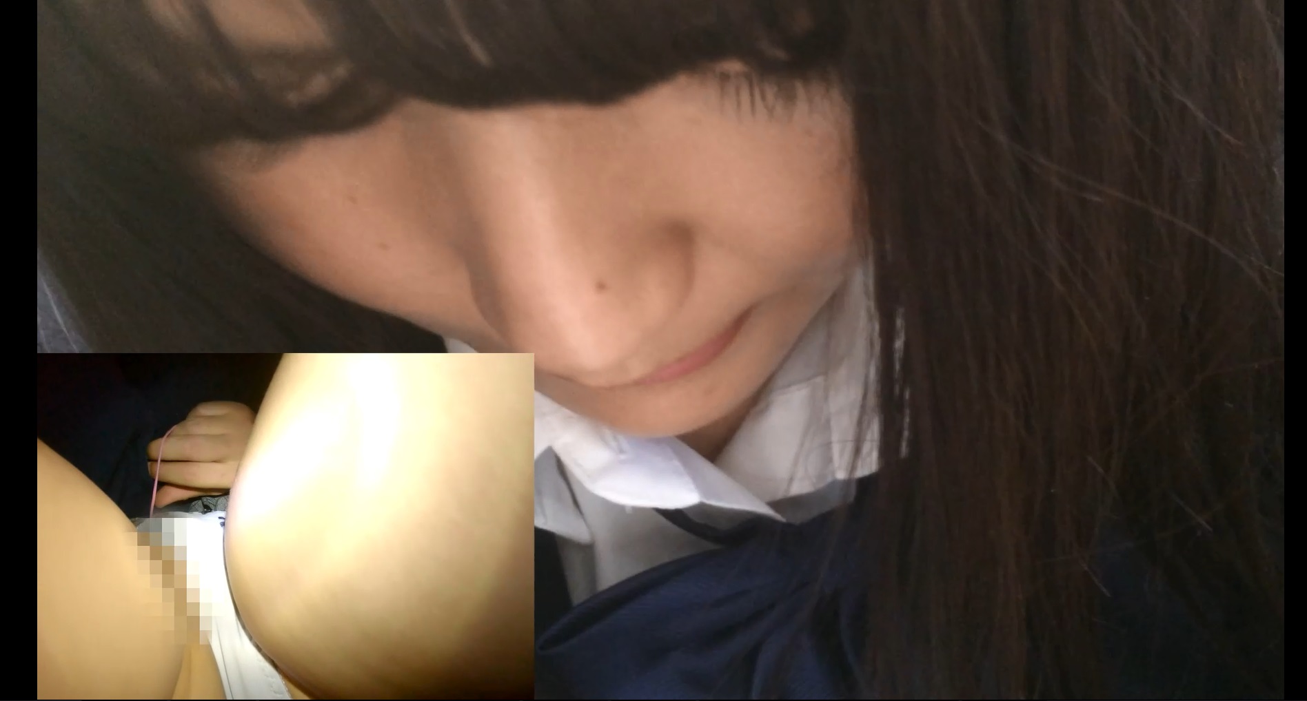 下はローター責めと別の痴漢の手が太ももを触っているのが見えますが、奥に見える黒ピンクの物体とそれに添えるように動く手。