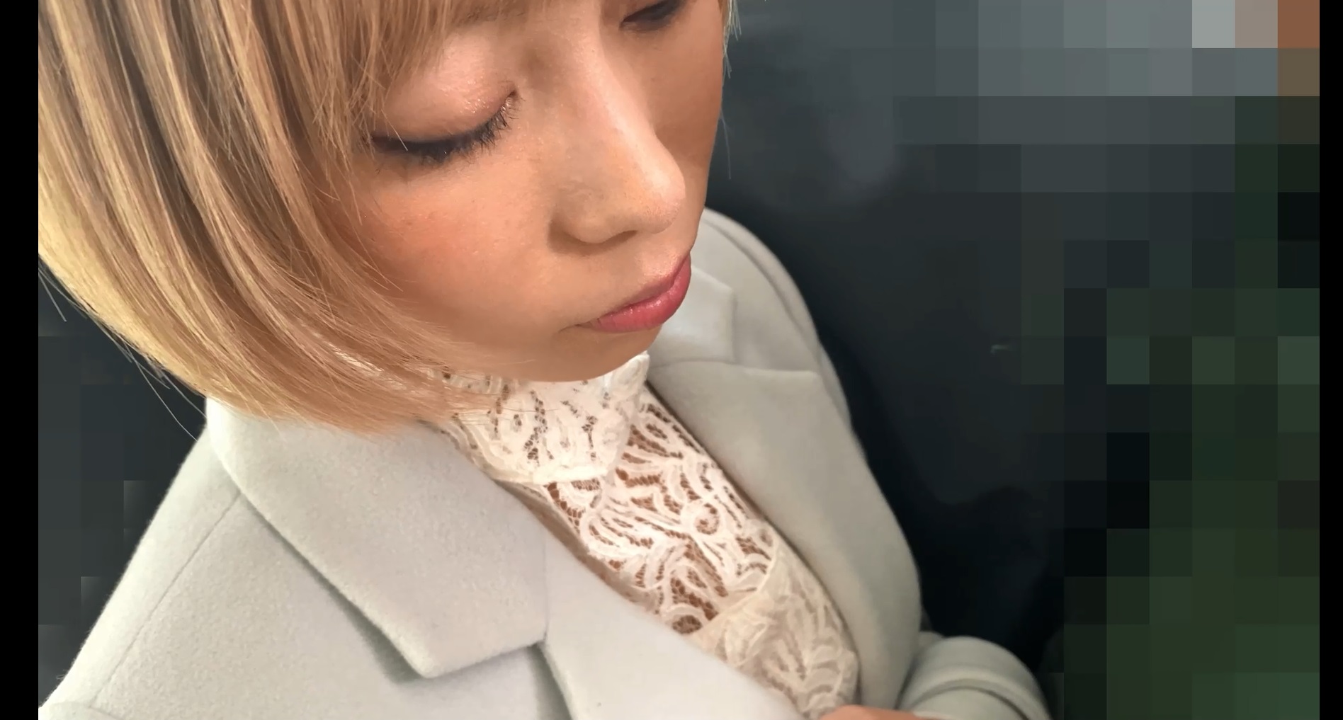 ホームでたたずむ金髪の女性。車内inし逆さ撮り。髪は金髪でしたが、下着は刺繍の入った白のパンティ。